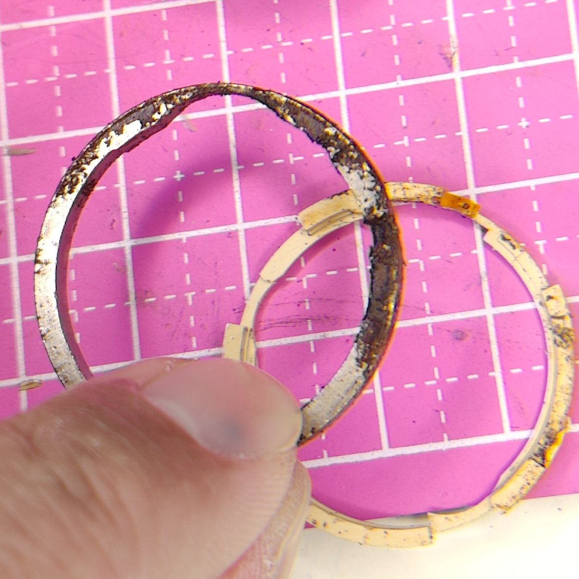 Again after battling with the hardened gasket, rust, I managed to persuade the case ring to part from the case by removing the dial from the front, and hammering on the case ring through the plastic movement ring, causing the plastic to crack in the process.