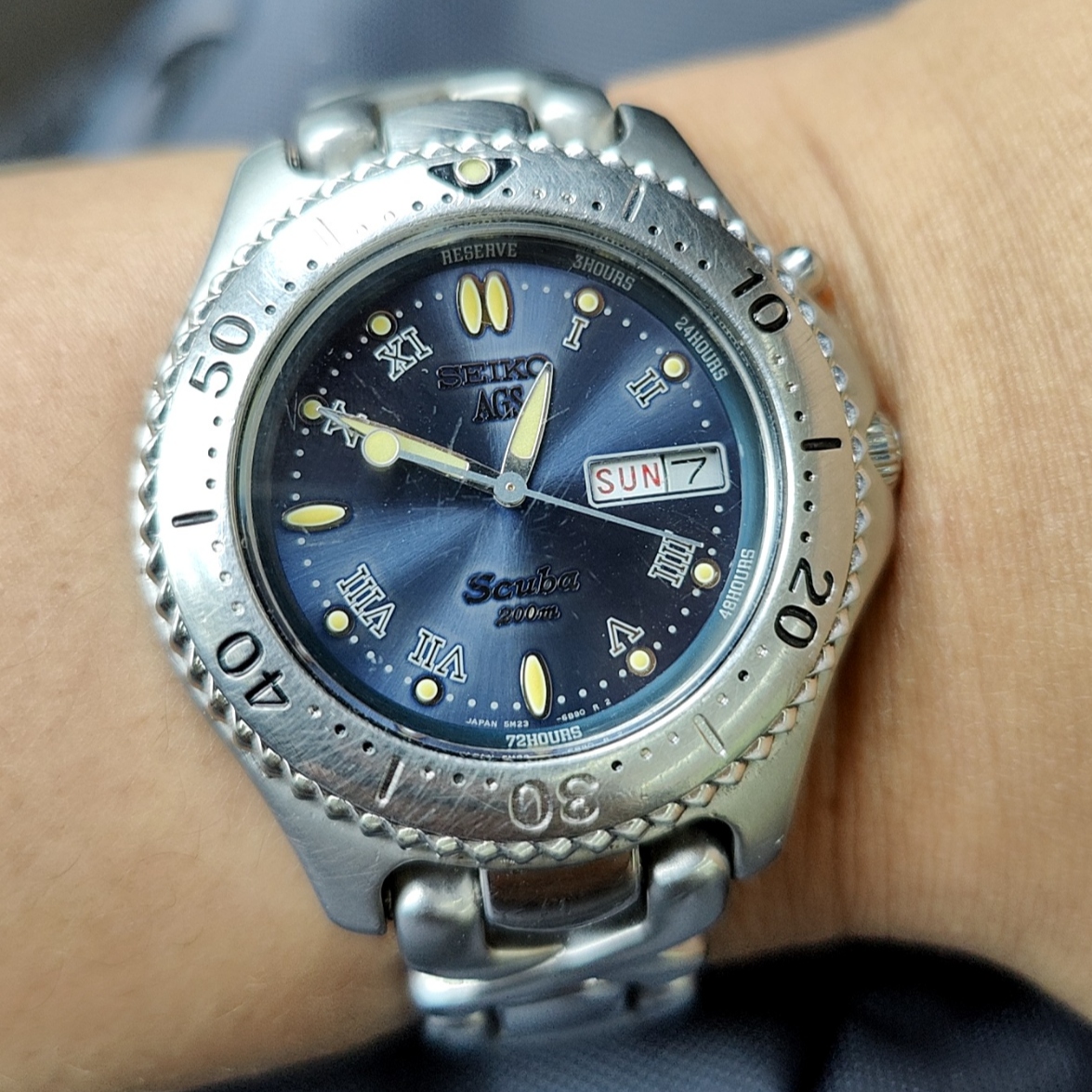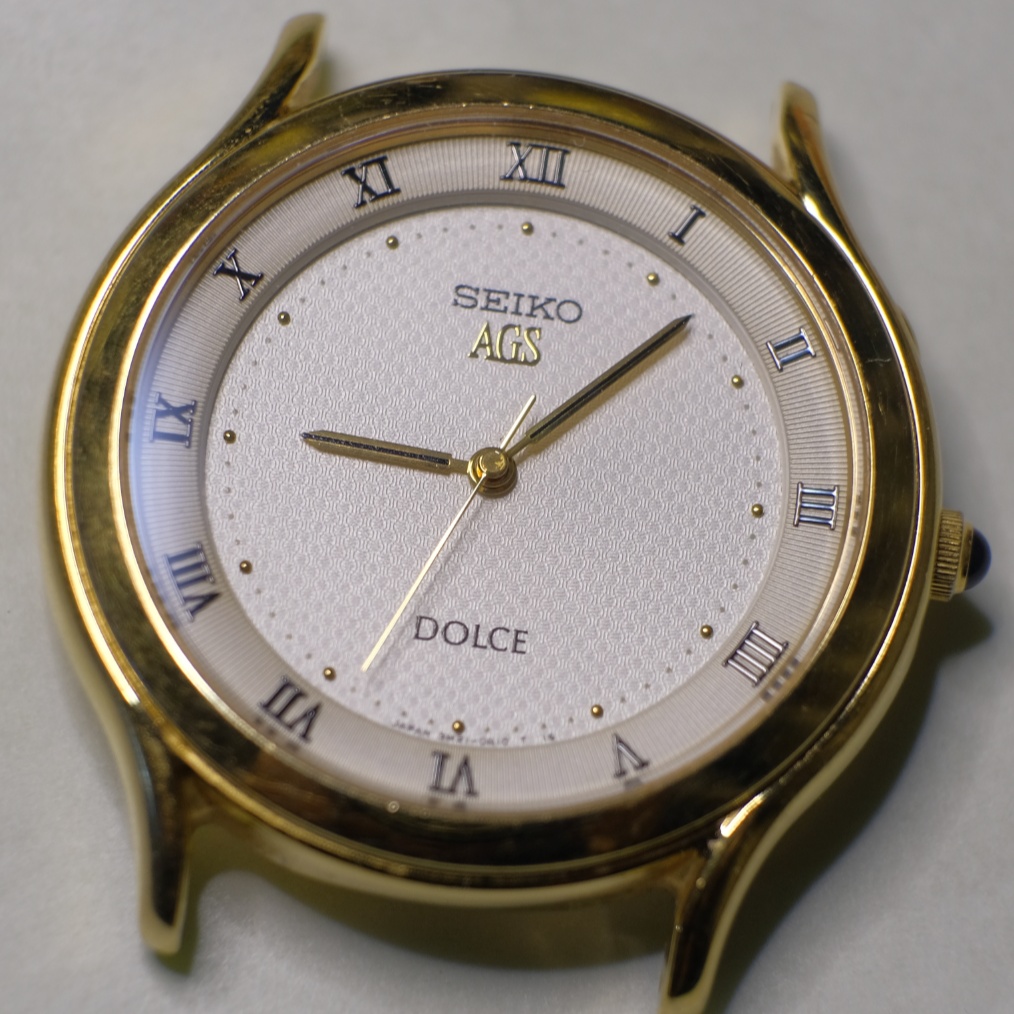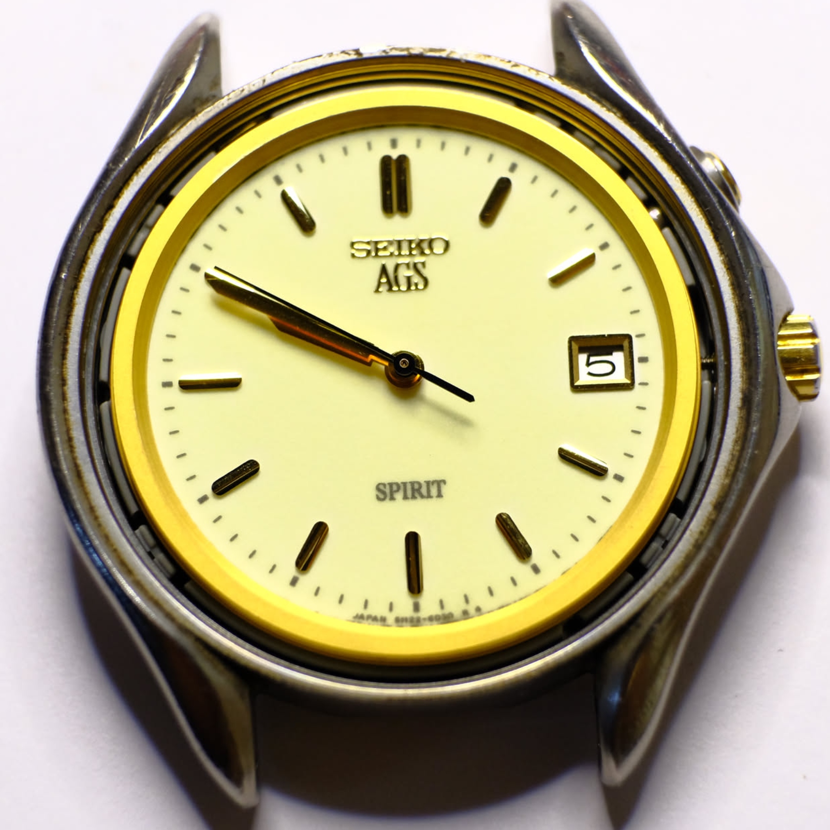 Of course it was not running. The exterior simply needs a clean. The bezel can be rotated. It even came with the original dedicated lug shape strap. After overcoming the caseback with some extra traction, a clean AGS 5M23 movement was found inside.