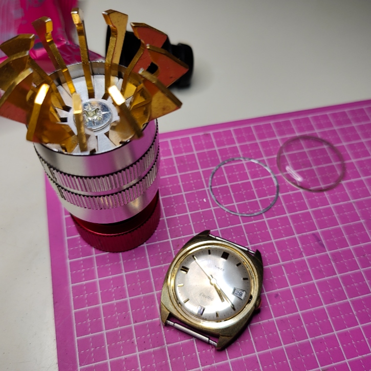 The acrylic crystal must be removed first to allow removal of the movement from the case. My Chinese crystal lift was working, with a bit of extra tools.